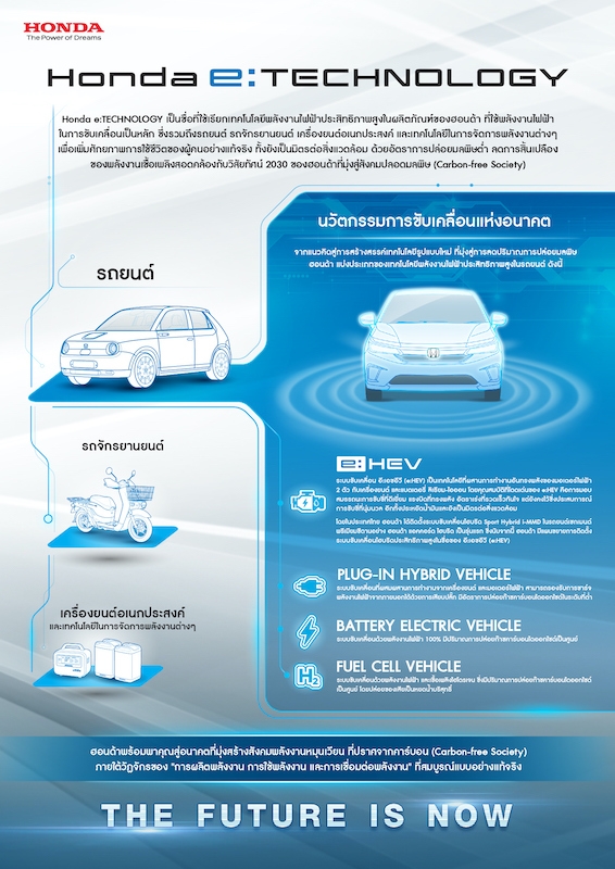 ทั้งนี้ ฮอนด้า ได้พัฒนาและติดตั้งเทคโนโลยีข้างต้นในรถยนต์ของฮอนด้า และส่งมอบสู่ลูกค้าแล้วหลากหลายรุ่น อาทิ ฮอนด้า อี รถซิตี้คาร์ที่ขับเคลื่อนด้วยพลังงานไฟฟ้า 100% และ ฮอนด้า คลาริตี้ ฟิวเซลล์ รถยนต์พลังงานไฮโดรเจนที่ได้เปิดตัวแล้วในประเทศญี่ปุ่น