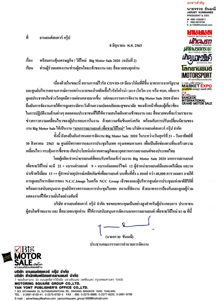 ทั้งนี้ ยังคงยืนยันกำหนดการจัดงาน Big Motor Sale 2020 ในระหว่างวันศุกร์ที่ 21 – วันอาทิตย์ที่ 30 สิงหาคม 2563 ณ ศูนย์นิทรรศการและการประชุมไบเทค กรุงเทพมหานคร เพื่อเป็นอีกช่องทางที่จะสร้างความเคลื่อนไหว กระตุ้นการซื้อขาย เกิดประโยชน์แก่ภาคเศรษฐกิจและอุตสาหกรรมยานยนต์ของประเทศไทย