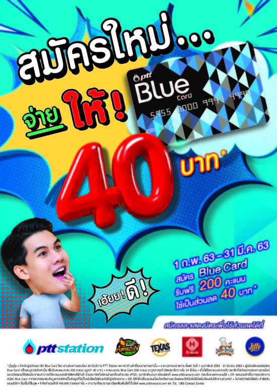 ยังคงแรงอย่างต่อเนื่องกับโปรโมชั่นดีๆ จากBlue Card ครั้งนี้มอบความพิเศษกว่าใคร สำหรับลูกค้าใหม่กับโปรโมชั่น “สมัครใหม่จ่ายให้ 40”เพียงสมัครสมาชิก Blue Card ตั้งแต่วันที่ 1 ก.พ. 2563 – 31 มี.ค. 2563 รับไปเลยคะแนนสะสมฟรี 200 คะแนน โดยสามารถใช้คะแนนแลกเป็นส่วนลดแทนเงินสดมูลค่า 40 บาท สำหรับผู้สมัครสมาชิก Blue Card ใหม่ ขั้นตอนการสมัครง๊ายง่าย… สมัครผ่านช่องทางออนไลน์เพียงคลิกเข้าไปที่ https://www.pttbluecard.com/th/auth/register/userหรือสมัครด้วยตัวเองที่สถานีบริการน้ำมัน PTT Station กว่า 1,900 สาขา และหน้าร้านค้าที่ร่วมรายการ อาทิ ร้านคาเฟ่ อเมซอน ,ร้านเท็กซัสชิคเก้น ,ร้านฮั่ว เซ่ง ฮง ติ่มซำ, ร้านแด๊ดดี้ โดและร้านสะดวกซื้อ จิฟฟี่ โดยคะแนนสะสม Blue Card 200 คะแนน จะถูกสะสมเข้าบัตรสมาชิกภายใน 24 ชั่วโมง ให้คุณได้ใช้อย่างคุ้มค่า