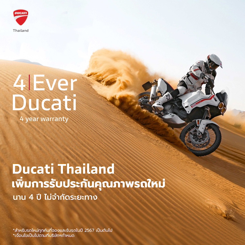 นายดอม เหตระกูล กรรมการผู้จัดการ บริษัท โมโตเร อิตาเลียโน จำกัด ผู้นำเข้าและจัดจำหน่าย รถจักรยานยนต์ ดูคาติ ในประเทศไทย อย่างเป็นทางการ เปิดเผยว่า เพื่อสร้างความพึงพอใจสูงสุดให้ลูกค้า ภายใต้กลยุทธ์บริการหลังการขายนำขาย ตั้งแต่เดือนมีนาคม 2567 นี้ ดูคาติ ประเทศไทย ได้มีการเพิ่มระยะเวลาการรับประกันตัวรถ หรือ วารันตี จากเดิม 3 ปีเป็น 4 ปี เพื่อเป็นการตอกย้ำถึงคุณภาพของรถดูคาติและสร้างความสบายใจให้กับลูกค้าทุกท่าน และบริษัทฯ ยังจัด Ducati Service Package เพื่อสร้างความอุ่นใจ คลายทุกความกังวลให้ลูกค้าที่ออกรถดูคาติทุกรุ่นในปีนี้เป็นพิเศษ โดยลูกค้าสามารถนำรถเข้ามารับการบริการตามรอบได้โดยไม่เสียค่าบริการนานถึง 3 ปี หรือระยะทาง 60,000 กิโลเมตร นอกจากนี้ บริษัทฯ ยังรับประกันอะไหล่ทุกชิ้นที่เปลี่ยนจากศูนย์บริการนานถึง 2 ปี และรับประกันงานซ่อมให้ลูกค้านานถึง 6 เดือน