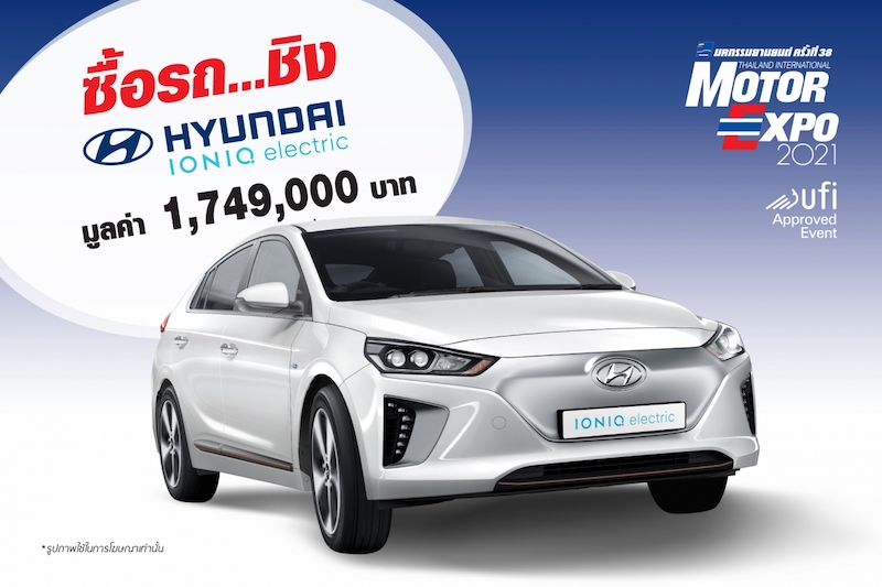 - “ซื้อรถ…ชิงรถ” เมื่อจองหรือซื้อรถยนต์ใหม่ภายในงาน มีสิทธิ์ชิงรถยนต์ HYUNDAI IONIQ ELECTRIC มูลค่า 1,749,000 บาท จำนวน 1 รางวัล