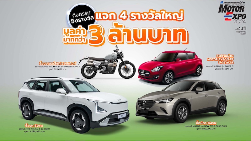 4. “ชมงานผ่าน MOTOR EXPO APP ชิงรางวัล” ผู้ชิงโชคต้องลงทะเบียนใน MOTOR EXPO APPLICATION พร้อมตอบแบบสอบถามให้ครบถ้วน ตั้งแต่วันที่ 15 พฤศจิกายน 2567 – 31 ธันวาคม 2567 มีสิทธิ์ชิงรถยนต์ SUZUKI รุ่น SWIFT GL มูลค่า 567,000 บาท