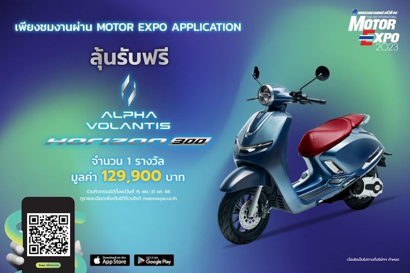 ดาวน์โหลด MOTOR EXPO APP ได้ทั้งระบบ iOS และ Android พร้อมมีกิจกรรม “ชมงานผ่าน MOTOR EXPO APP ชิงรางวัล” ชิงรถจักรยานยนต์ ALPHA VOLANTIS รุ่น HORIZON300 มูลค่า 129,900 บาท จำนวน 1 รางวัล ตั้งแต่วันที่ 15 พฤศจิกายน 2566 – 31 ธันวาคม 2566