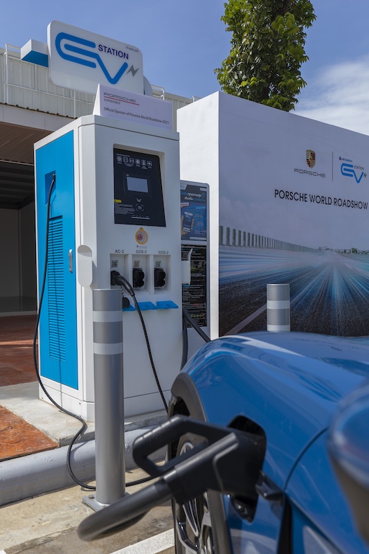 EV Station PluZ ร่วมเป็นหนึ่งในผู้สนับสนุนงาน Porsche World Roadshow 2021 ซึ่งเป็นกิจกรรมที่ บริษัท เอเอเอส ออโต้ เซอร์วิส จำกัด (AAS) ผู้นำเข้าและตัวแทนจำหน่ายรถยนต์ Porsche อย่างเป็นทางการแต่เพียงผู้เดียวในประเทศไทยจัดขึ้น ระหว่างวันที่ 5-14 พฤศจิกายน 2564 ที่ผ่านมา เพื่อให้ลูกค้าและผู้ที่สนใจได้เรียนรู้สมรรถนะของรถยนต์ Porsche พร้อมเพิ่มทักษะการควบคุมและการขับรถได้อย่างปลอดภัย รวมทั้งนำรถยนต์ Porsche รุ่น Taycan ซึ่งเป็นรถยนต์ไฟฟ้า มาร่วมทดสอบชาร์จไฟจากเครื่องชาร์จภายในเครือข่าย EV Station PluZ แบบ Quick Charge ด้วยกำลังไฟ 160 กิโลวัตต์ ณ สถานีบริการ PTT Station บจก.ปิโตรเลียม (ถ.347) จ.ปทุมธานี เพื่อสร้างความมั่นใจในเรื่องกำลังไฟ และความเร็วในการชาร์จจาก 0%-80% เพียง 40 นาที