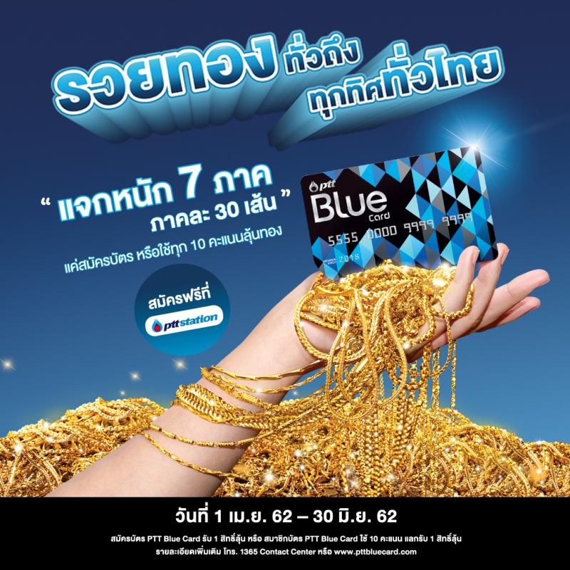 PTT Blue Card เปิดแคมเปญใหญ่ แจกหนัก “รวยทองทั่วถึงทุกทิศทั่วไทย” ให้ทุกคนไม่ว่าจะ สาย กิน เที่ยว ช้อป ได้ฟินพร้อมกันทั้งประเทศ กระจายความรวยเดินสายแจกทอง 7 ภาค จัดเต็มภาคละ 30 เส้น รวมทั้งสิ้น 210 เส้น พร้อมโอกาสได้ทองมากกว่าเดิม ไม่ว่าจะอยู่ที่ไหนก็มีโอกาสได้รวยทองอย่างทั่วถึง ให้แฮปปี้ถ้วนหน้ากับ PTT Blue Card ตั้งแต่วันนี้ ถึง 30 มิถุนายน 2562