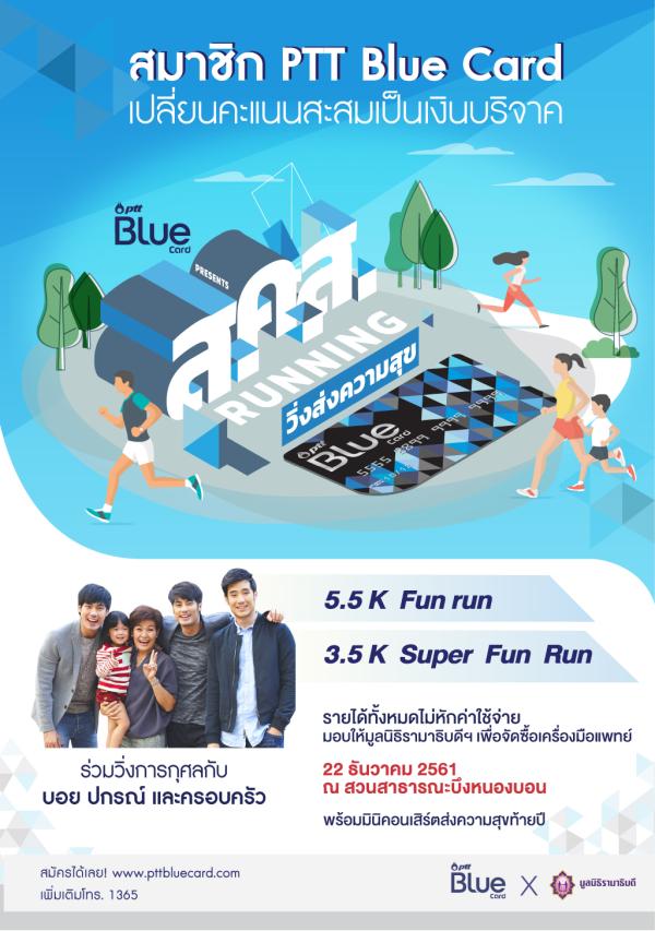 PTT Blue Card ขอเชิญชวนสมาชิกทุกท่าน ร่วมวิ่งการกุศลในงาน “PTT Blue Card วิ่งส่งความสุข” ในวันที่ 22 ธันวาคม 2561 ณ สวนสาธารณะบึงหนองบอน กรุงเทพมหานคร เวลา 05.00 น. – 9.00 น. พร้อมชมมินิคอนเสิร์ตส่งความสุขท้ายปีจาก บอย-ปกรณ์ และครอบครัว โดยค่าสมัครในการร่วมกิจกรรมทั้งหมดไม่หักค่าใช้จ่ายมอบให้มูลนิธิรามาธิบดีฯ ในพระราชูปถัมภ์สมเด็จพระเทพรัตนราชสุดาฯ สยามบรมราชกุมารี เพื่อสมทบทุนการจัดซื้อเครื่องมือแพทย์ สถาบันการแพทย์จักรีนฤบดินทร์