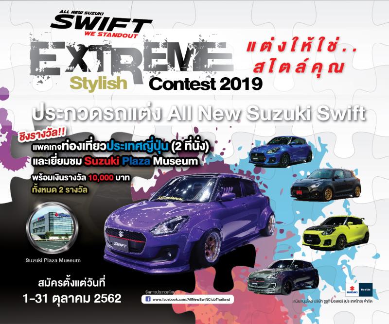 All New Swift Club Thailand และ บริษัท ซูซูกิ มอเตอร์ (ประเทศไทย) จำกัด ผู้สนับสนุนหลัก ขอเชิญชวนเจ้าของ Suzuki Swift ผู้รักในการตกแต่งรถยนต์ทุกท่านเข้าร่วมกิจกรรม Suzuki Swift Extreme Stylish Contest 2019 เปิดรับสมัคร 1 – 31 ตุลาคม 2562 นี้