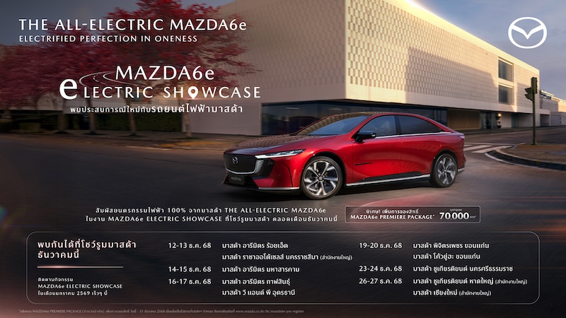 สำหรับ The All-Electric Mazda6e ที่เปิดตัวในงาน มอเตอร์ เอ็กซ์โป ในครั้งนี้ ก็ได้รับกระแสตอบรับอย่างล้นหลาม ด้วยยอดจองสิทธ์ Mazda6e Premiere Package* กว่า 3,000 สิทธิ์ และยังคงมีลูกค้าสอบถามเข้ามาอย่างต่อเนื่อง มาสด้าเล็งเห็นถึงกระแสการตอบรับในครั้งนี้ จึงได้จัดงาน ‘Mazda6e Electric Showcase’ ที่โชว์รูมมาสด้า เพื่อให้ลูกค้าที่อาศัยอยู่ในจังหวัดอื่นๆ นอกเหนือจากกรุงเทพฯ ได้มีโอกาสสัมผัสรถจริง และได้รับข้อมูลเกี่ยวกับรถก่อนตัดสินใจจองรับสิทธิ์ Mazda6e Premiere Package* โดยมาสด้าได้เพิ่มสิทธิ์ในการจอง Mazda6e Premiere Package* จนถึง 31 ธันวาคม 2568* เพื่อแทนคำขอบคุณลูกค้าที่ให้การตอบรับมาสด้าเป็นอย่างดี โดยกิจกรรมจะเริ่มจัดขึ้นตั้งแต่วันที่ 12 ธันวาคม 2568 เป็นต้นไป ที่โชว์รูมมาสด้าตามภูมิภาคต่างๆ ทั่วประเทศ ซึ่งลูกค้าที่สนใจชมยนตรกรรมไฟฟ้า The All-Electric Mazda6e สามารถสอบถามข้อมูลได้ที่ผู้จำหน่ายมาสด้าใกล้บ้าน หรือตรวจสอบตารางการจัดกิจกรรมเพิ่มเติมที่ www.mazda.co.th